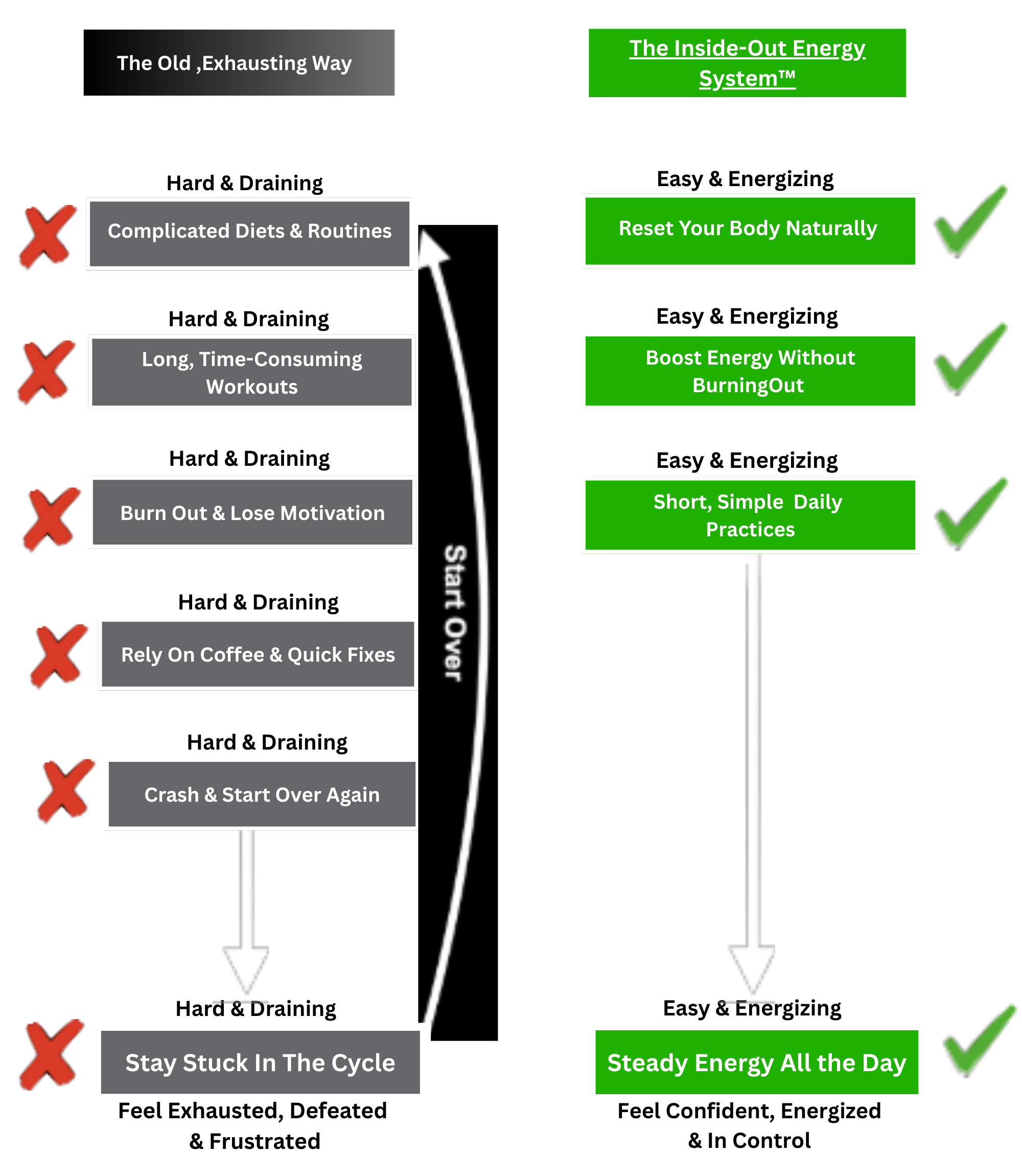 Join the Inside-Out Energy System™ today and discover what it feels like to wake up refreshed, move through your day with stable energy, and go to bed knowing your body is getting stronger instead of breaking down.
